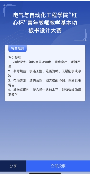10月22日,大赛圆满完成最终评比工作,评审环节学院开通网络投票通道,诚邀全体教师参与评选,充分彰显公平性与参与度。为广泛凝聚教师智慧,通过问卷星形式将40份板书设计作品进行展示。全体教师可通过手机或电脑随时浏览作品细节,从“内容设计”“书写规范”“布局美观”“教学适用性”四大维度进行综合评价。活动期间,全院师生积极参与,这场“指尖上的评选”不仅发掘了教学巧思,更激发了全员参与教学创新的热情。