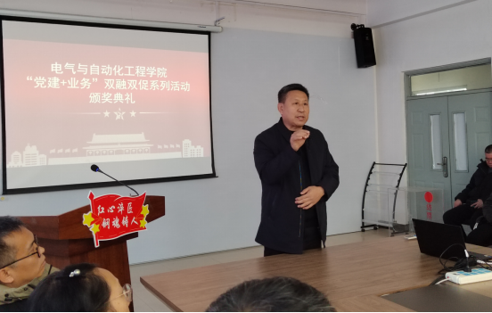 电气与自动化工程学院党总支始终坚持以党建引领方向,以业务夯实基础,本学期通过开展“党建+业务”双融双促模式为驱动,开展了7项活动,5项赛事。为表彰在系列活动中表现突出的先进集体与优秀个人,进一步发挥典型示范引领作用,凝聚全院发展合力,12月17日,电气与自动化工程学院在博慧楼2区109室举行“党建+业务”双融双促系列活动颁奖典礼。副校长闫海军、领导班子成员和全院教职工参加了此次颁奖典礼,典礼由党总支书记唐梅主持。